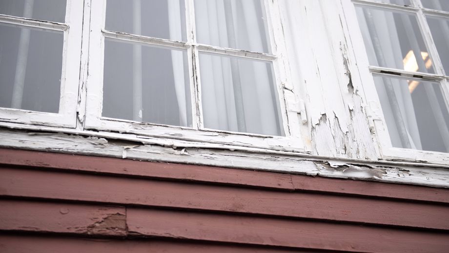 Gymnastiksalens facade er pilrådden. Træbeklædningen er flere steder splintret, mens lag af tørret maling hænger i store flapper og blæser i vinden. Det ligner solbrændt hud, der er ved at blive udskiftet.