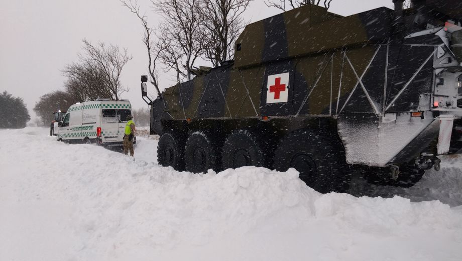3. januar sidste år blev store dele af Midt- og Nordjylland ramt af snestorm. Hæren og Trænregimentet stillede med 12 Piranhaer i ambulancekonfiguration til at støtte det civile beredskab i snestormen. Foto: Forsvarsgalleriet/ Forsvaret